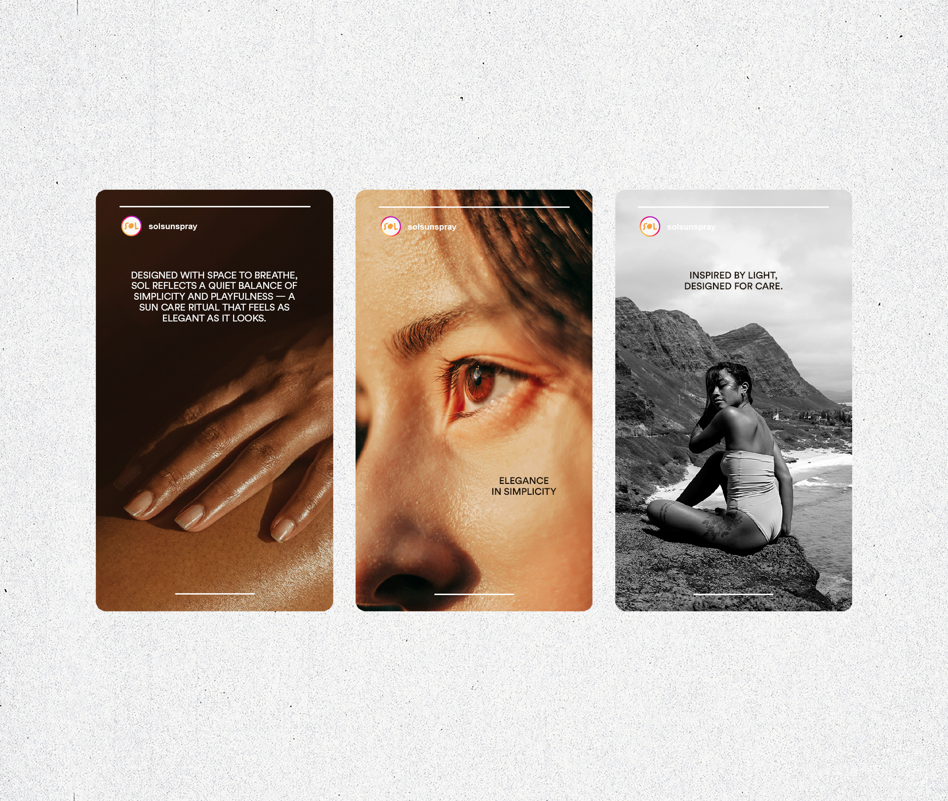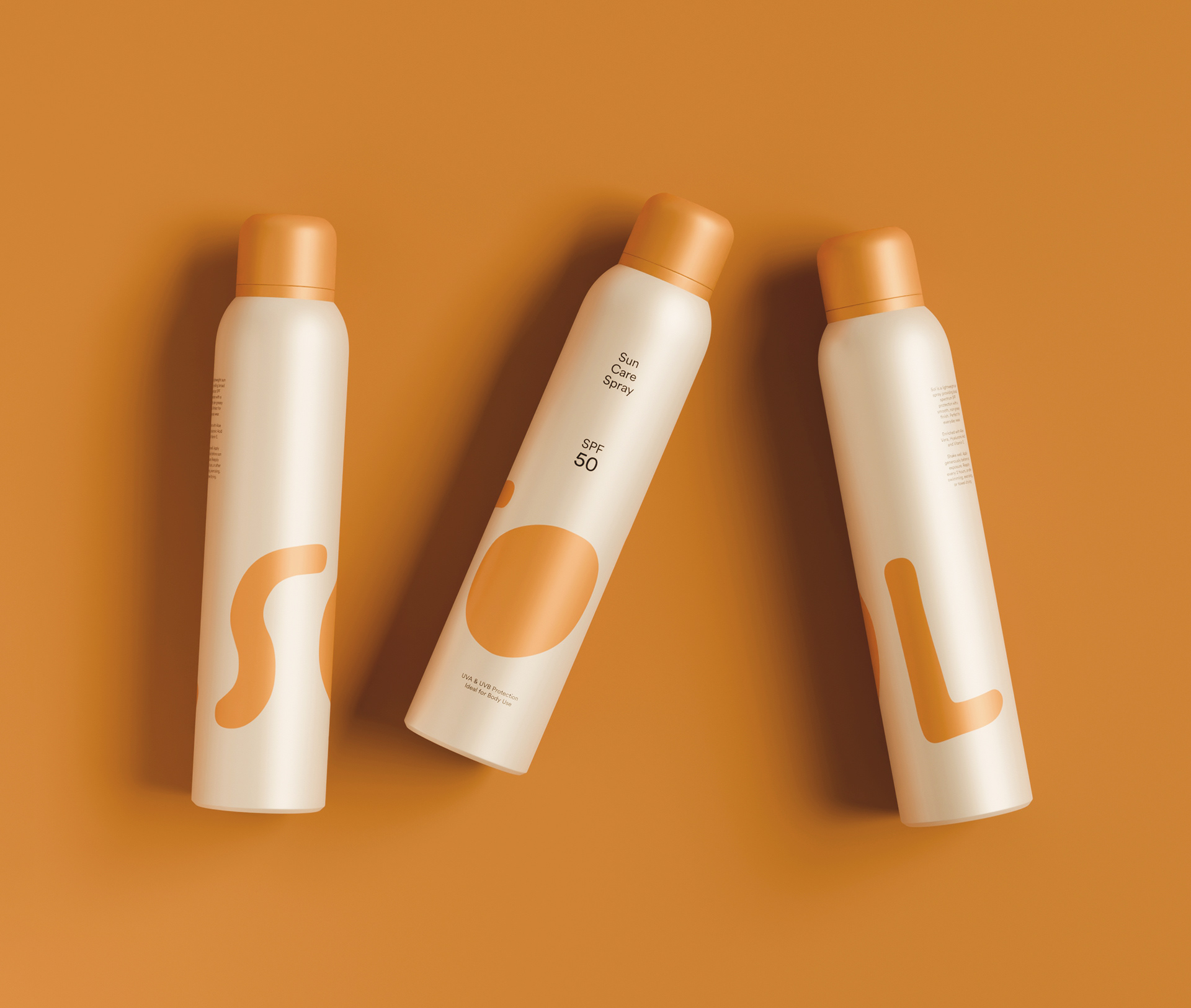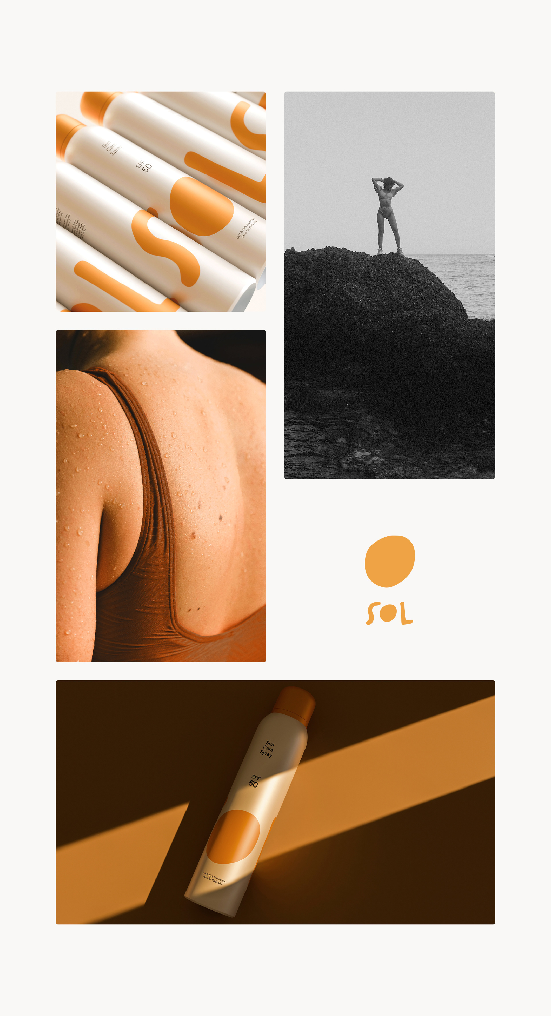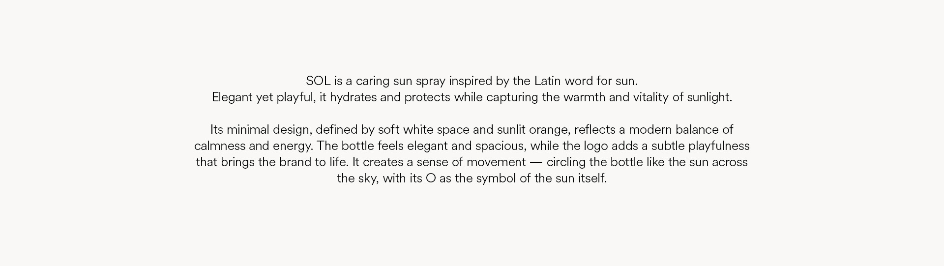 SOL je sprej za sunčanje osmišljen da štiti i hidrira kožu, spajajući funkcionalnost sa estetikom. Minimalni dizajn i topli narandžasti detalji odražavaju modernu ravnotežu mira i energije, dok kružni logo suptilno simbolizuje sunce i osjećaj kretanja.